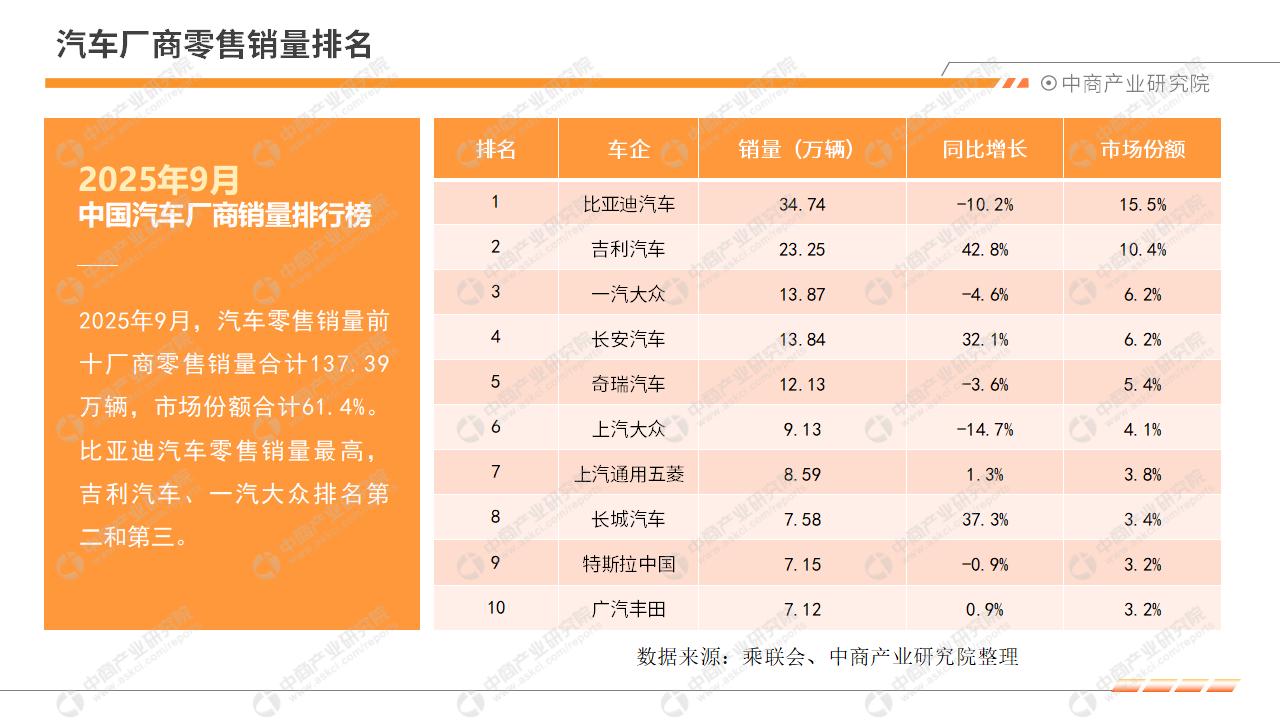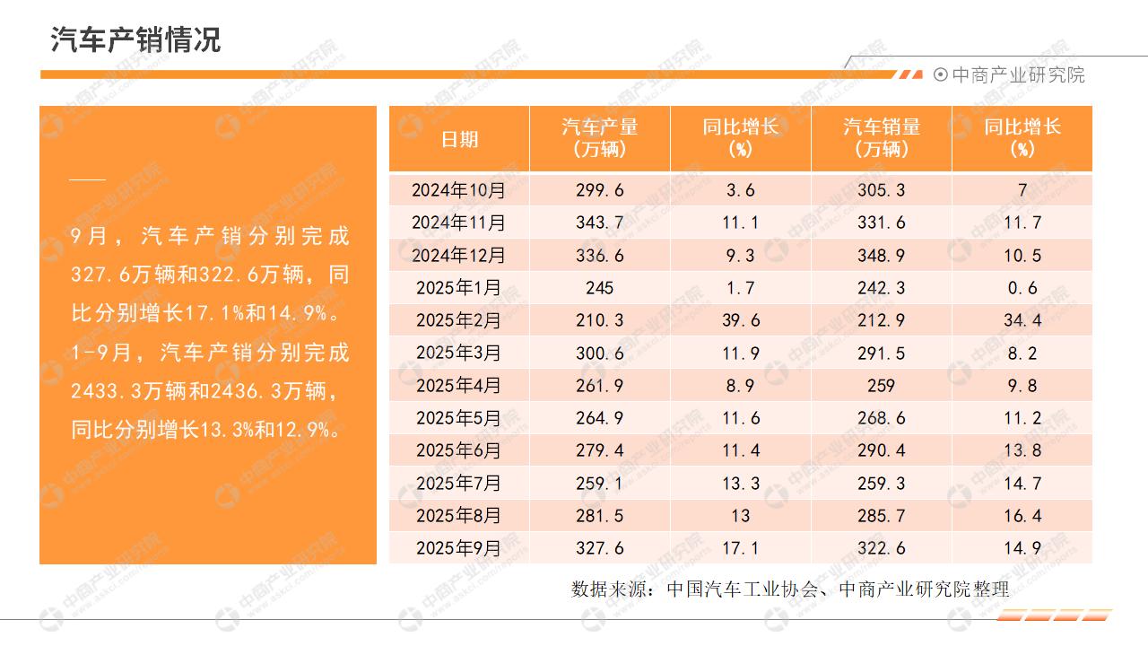 宏观经济的持续向好,对汽车市场的平稳运行起到重要推动作用。2025年9月,汽车产销分别完成327.6万辆和322.6万辆,同比分别增长17.1%和14.9%。其中,新能源汽车产销分别完成130.7万辆和128.7万辆,同比分别增长48.8%和42.3%。