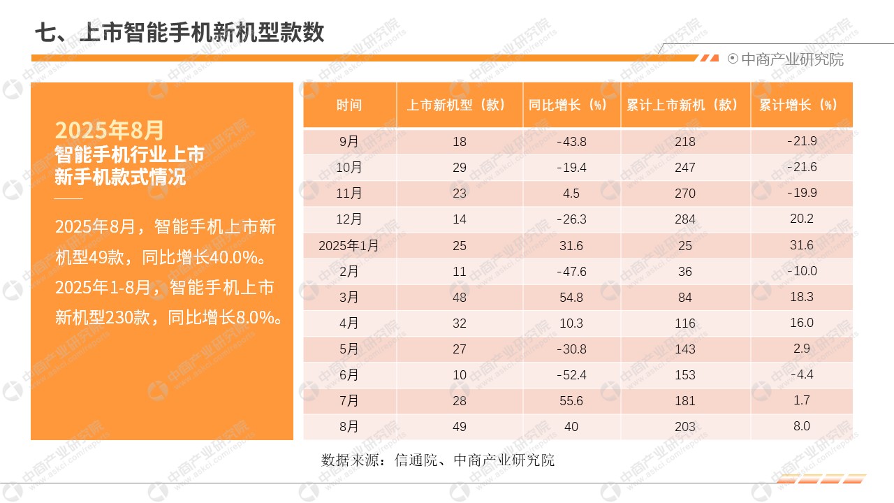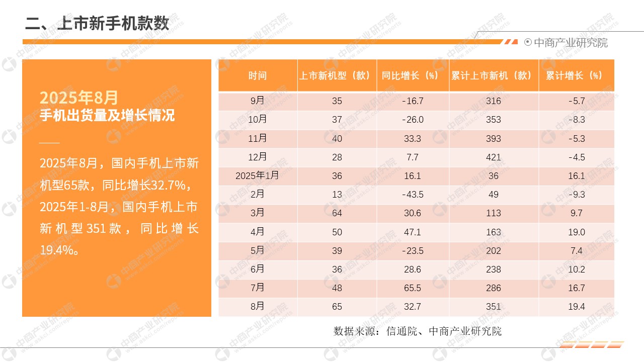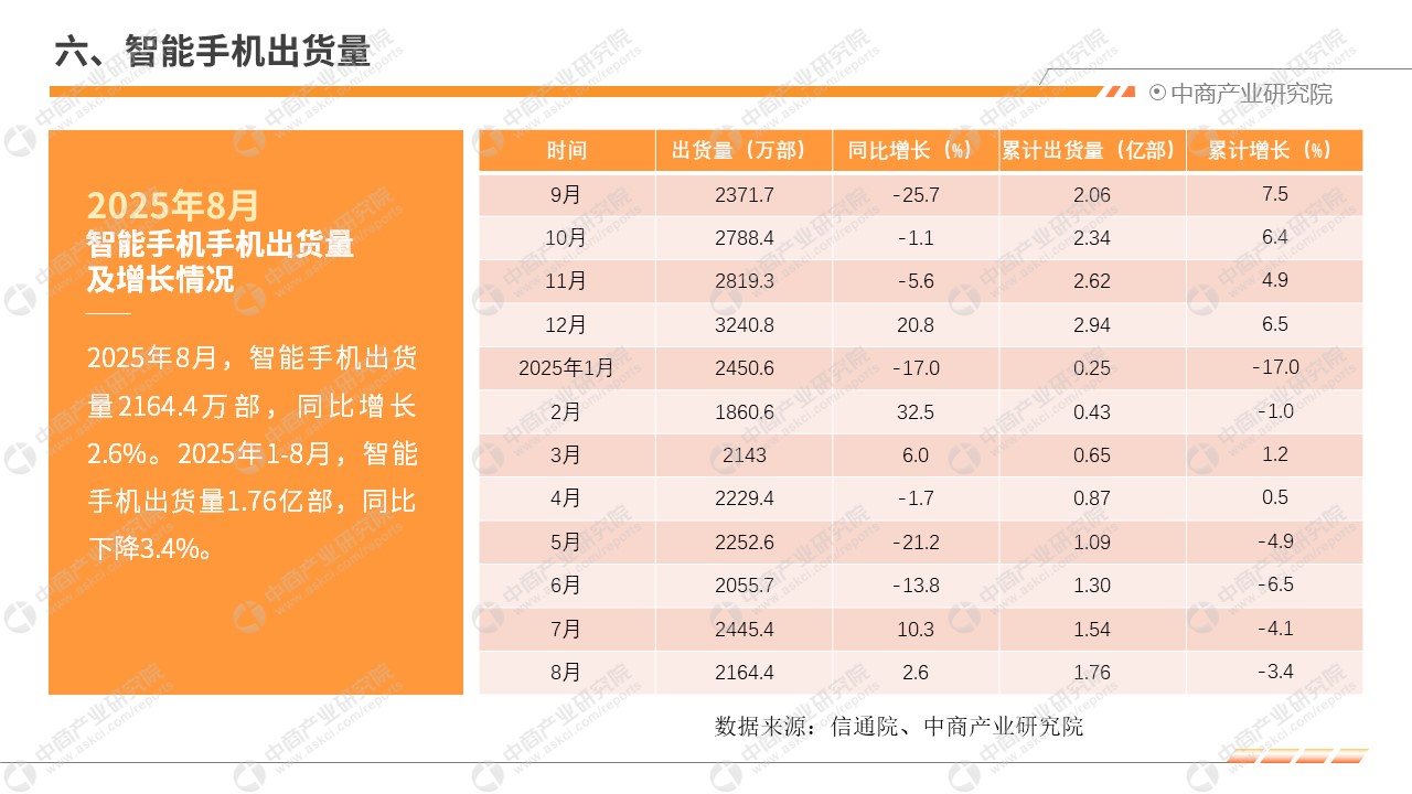 2025年8月,国内市场手机出货量2260.3万部,同比下降6.0%。2025年1-8月,国内市场手机出货量1.92亿部,同比下降1.7%。