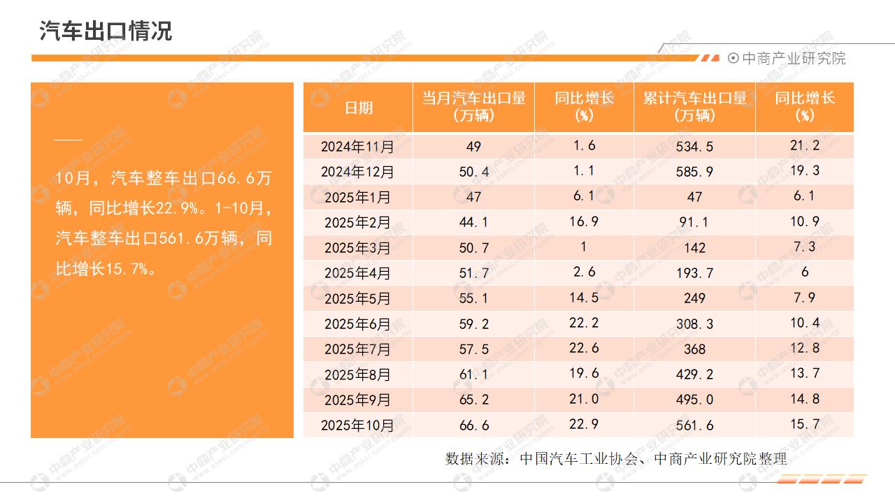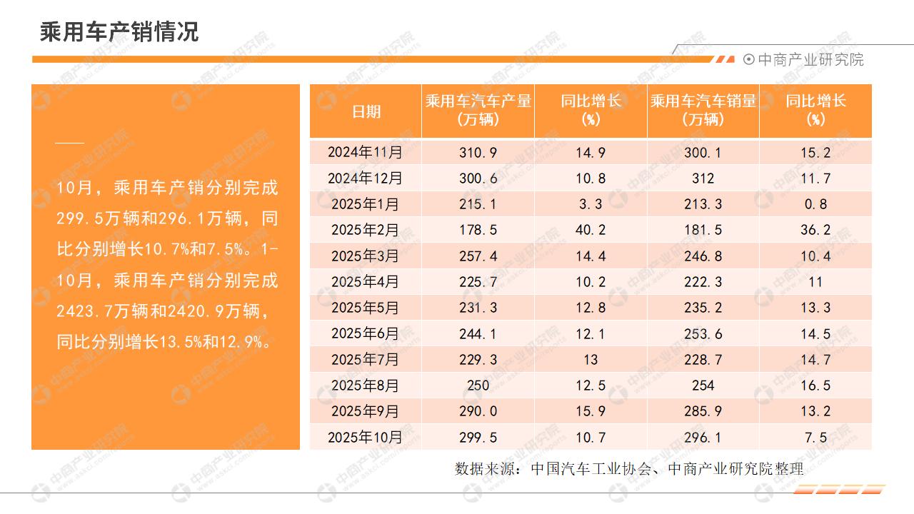 10月,汽车市场延续良好发展态势,月度产销创同期新高。2025年10月,汽车产销分别完成335.9万辆和332.2万辆,环比分别增长2.5%和3%,同比分别增长12.1%和8.8%。2025年1-10月,汽车产销分别完成2769.2万辆和2768.7万辆,同比分别增长13.2%和12.4%。