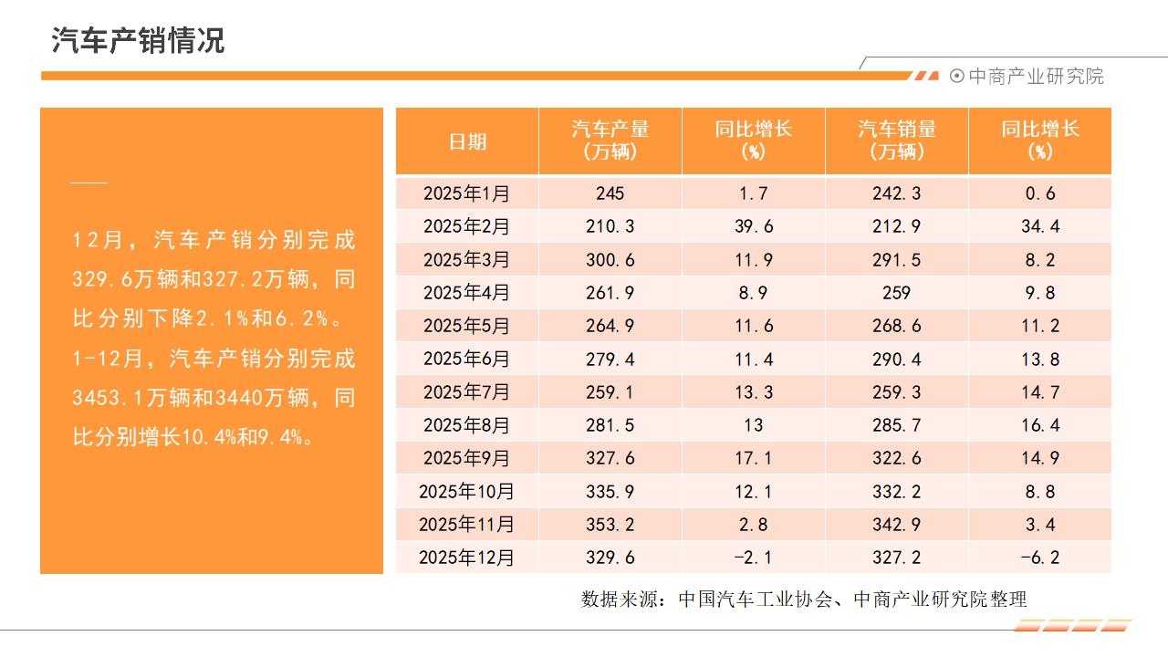 2025年,产销量再创历史新高,产销规模连续3年保持在3000万辆以上。汽车产销分别完成3453.1万辆和3440万辆,同比分别增长10.4%和9.4%。