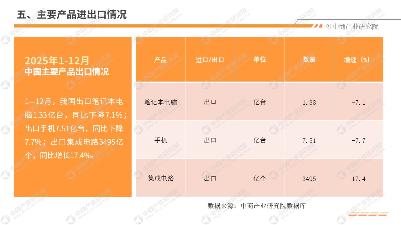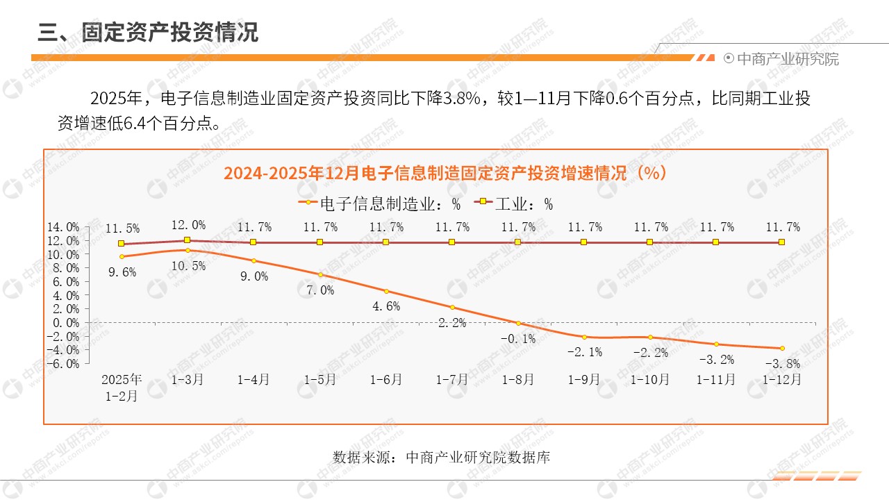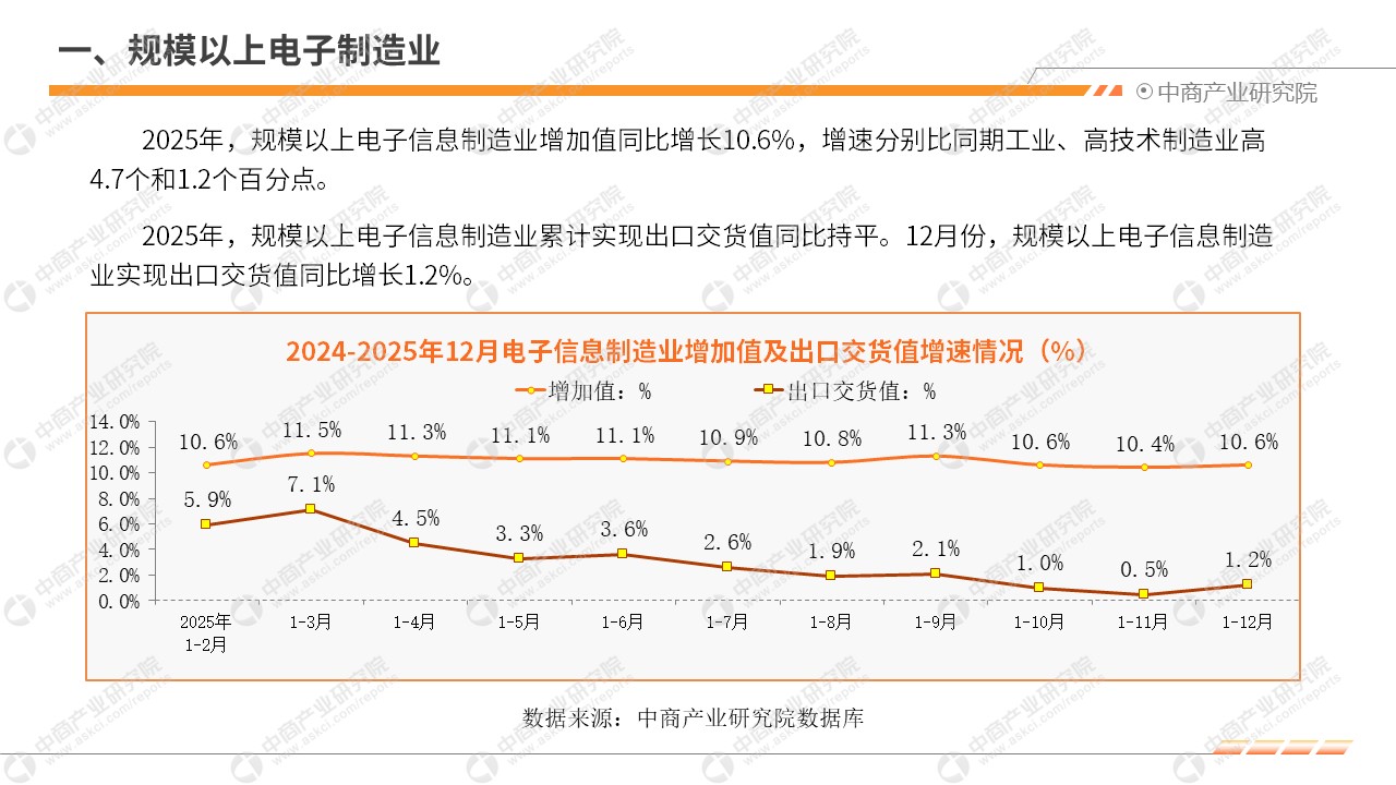 中商情报网讯:2025年,我国电子信息制造业生产快速增长,出口同比持平,效益稳步向好,投资持续下滑,行业整体发展态势良好。
